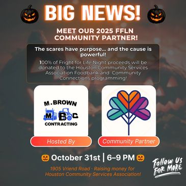 Fright for Life Night 2025 proudly supports Houston Community Services Association (HCSA). HCSA provides essential programs including the Food Bank and Community Connections, ensuring families in our region have access to food, resources, and support. By partnering with HCSA, this event helps strengthen community wellbeing and create las